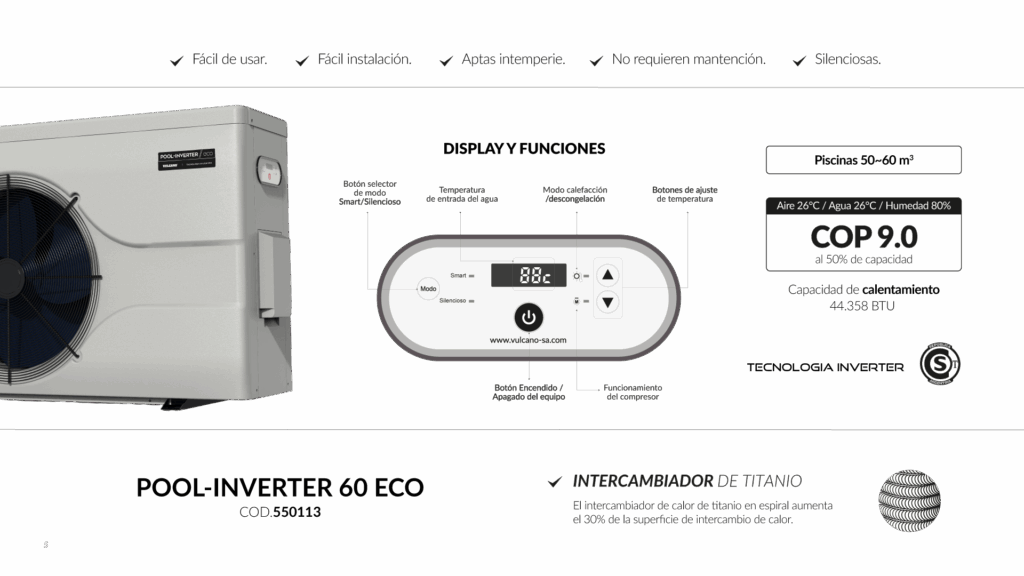 Está equipada con un intercambiador de calor de titanio espiralado, que mejora en un 30% la transferencia térmica, y cuenta con modos de funcionamiento Smart y Silencioso para adaptarse al uso diario. Incluye sistema de descongelamiento automático.