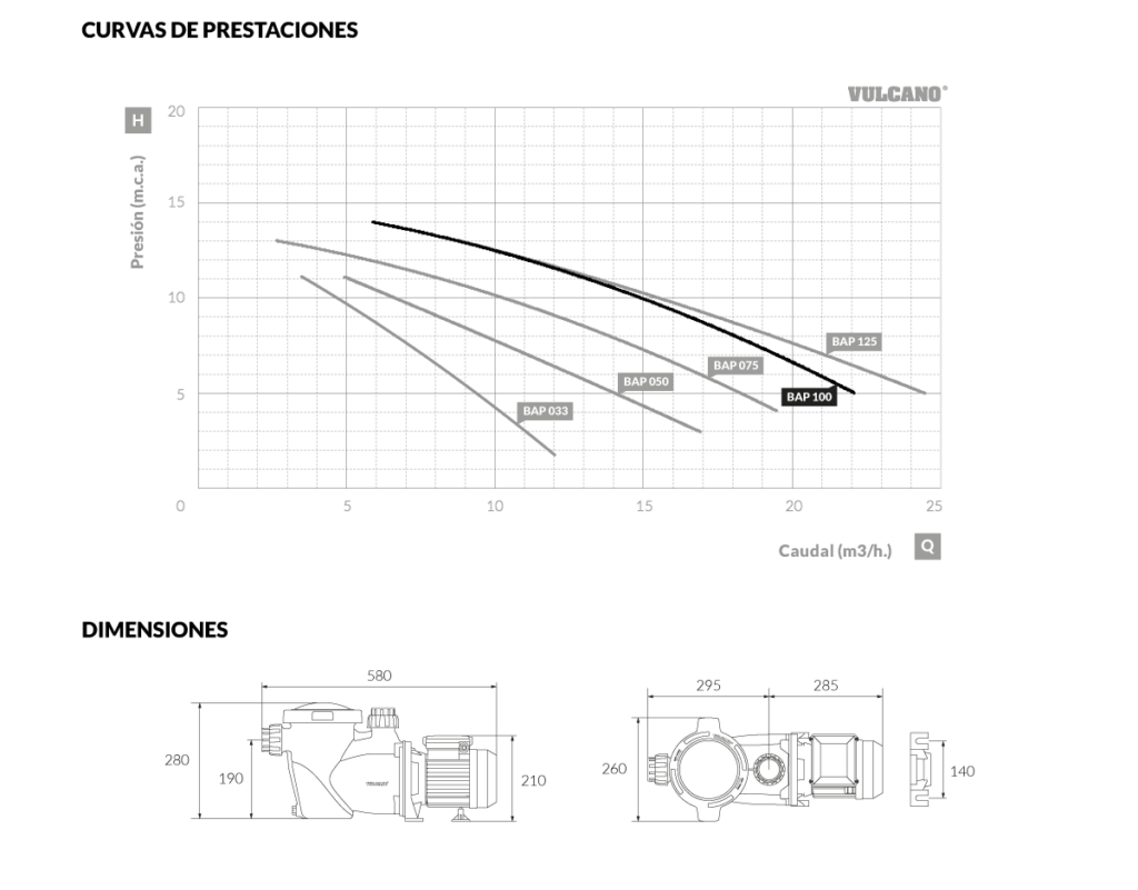 Bomba autocebante para piscina BAP 100 - Motor IT Vulcano. Ofrece un óptimo rendimiento para responder a las exigencias del uso profesional. Es utilizada para la recirculación de grandes caudales de agua principalmente en grandes piscinas.