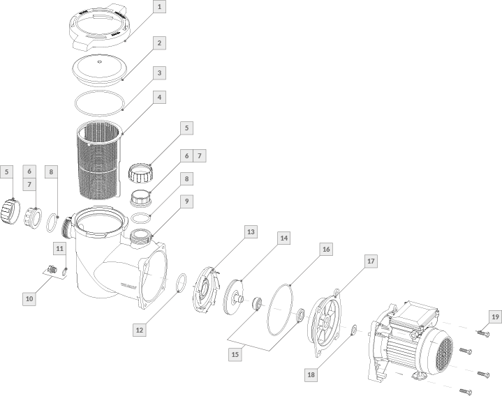 Cuenta con pre-filtro incorporado, canasto atrapa hojas de gran tamaño, tapa tipo mariposa de rápida apertura con un ¼ de giro y uniones dobles incorporadas. Provista con bujes para roscar de 1 ½” y de ø50 mm para pegar caños de PVC, para adaptarse a la cañería de la instalación.