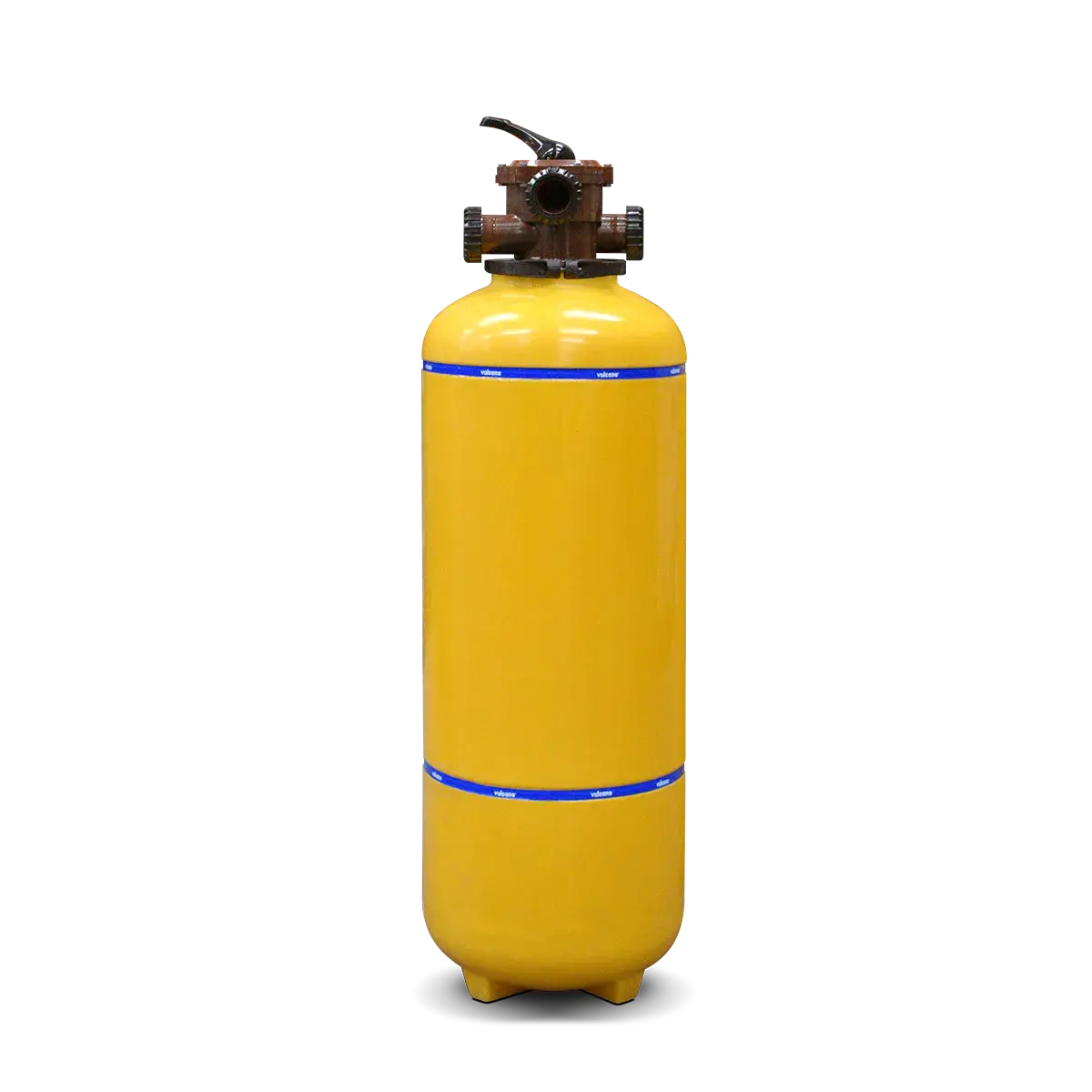 Filtro rotomoldeado VF-2000 de ø430 mm con multiválvula manual de seis vías. Pueden ser utilizados como filtro de sedimentos o como filtro de carbón activo, generalmente para el embotellado de agua y soda.