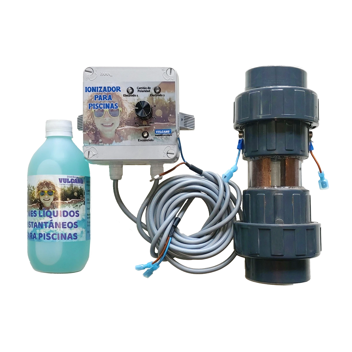 Ionizador eléctrico 120 m³ - 220V Vulcano. Ayuda a mantener el agua de tu piscina limpia y libre de algas. Funciona liberando iones de cobre en el agua, los cuales eliminan microorganismos y reducen hasta un 80-90% el uso de cloro.
