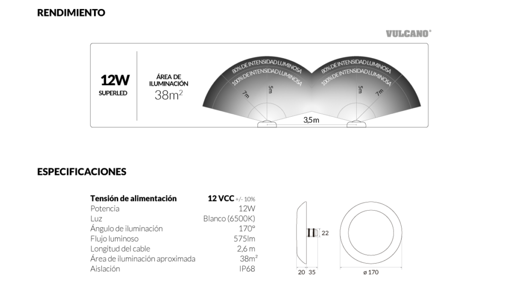 Luminaria subacuática SuperLED Vulcano 12W de luz blanca 12 VCC. Con ángulo de apertura de 170°, brinda excelente potencia de iluminación con niveles muy bajos de consumo energético. Esta luz, fabricada completamente en policarbonato de alta calidad, es compacta, delgada y de fácil instalación.